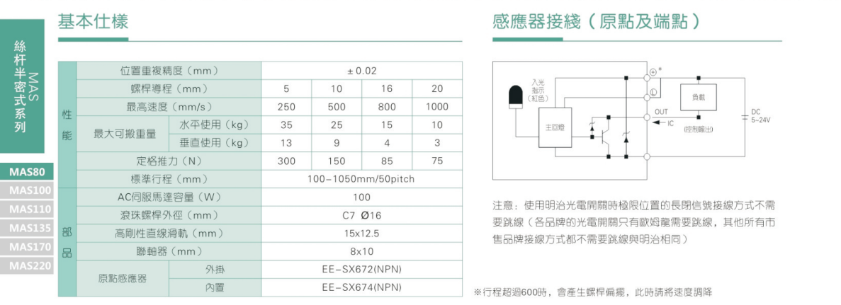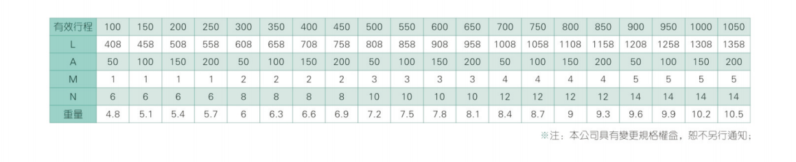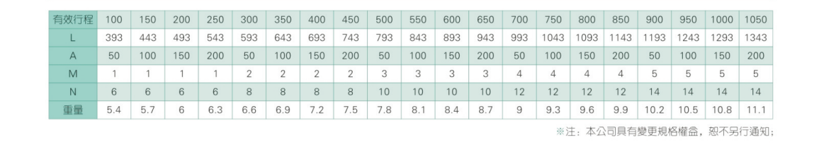 2、螺桿轉速超過臨界轉速時可能發(fā)生共振,臨界轉速和螺桿長度有關,故滾珠螺桿的臨界轉速也間接決定了滑臺模組的有效行程和總長度,有效行程和常用螺桿規(guī)格轉速的關系如下列表格。