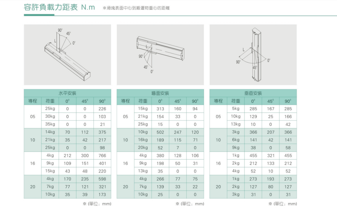 3、加減速度會使搬運質(zhì)量產(chǎn)生慣性負荷,加減速度越大可搬運質(zhì)量會越?。欢疫^大的加減速度會產(chǎn)生較大的重勢力,設計時需納入考量規(guī)范。